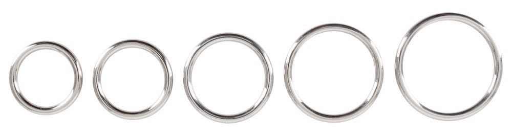 5-piece cock/ball ring set Professional from Bad Kitty for strong male performance and an exciting sight. The seamless rings are made out of smoothly polished carbon steel and have different diameters. They can be cooled down or warmed up for fancy temperature play.