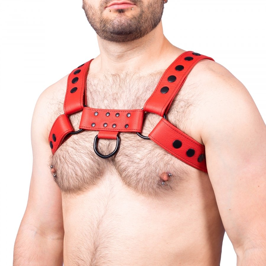 This red leather harness is an ideal accessory to highlight the torso and achieve an SM look.