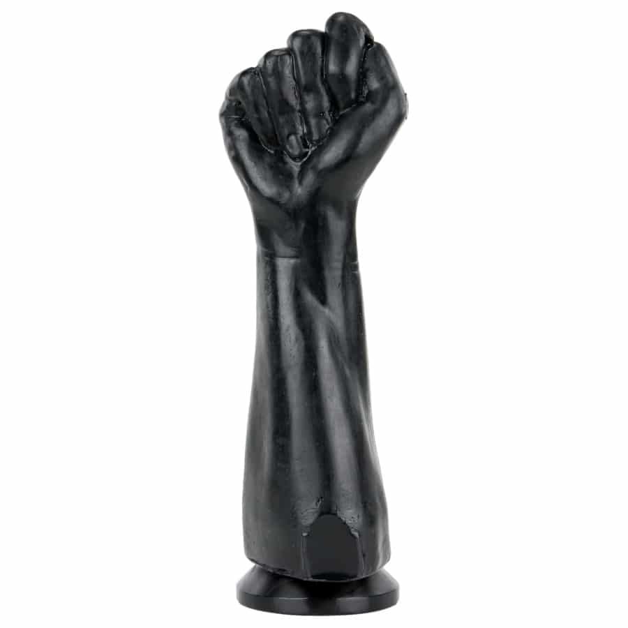 It is made with a forearm and closed fist shape. The dimensions are realistic. With a suction cup.