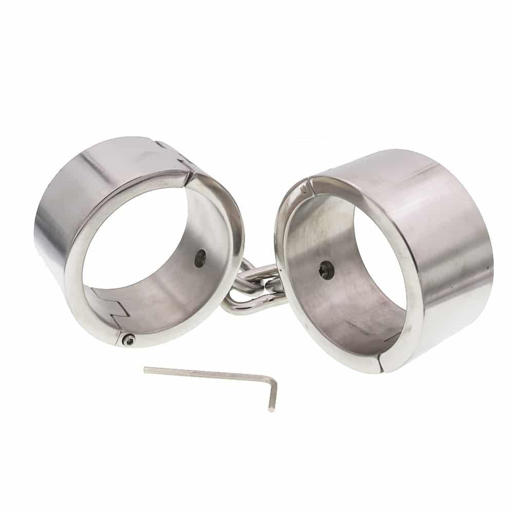 Each slave needs to have their own custom made set of wrist shackles. These irons will put them in their place. Made from strong, cold, heavy steel allowing long use and wear. Our blacksmith custom makes this item by hand. Locks with a stainless steel allen screw, opens with allen key (supplied).