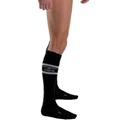 These are the brand new Mister B Football Socks from the Mister B URBAN Collection, which consists of sexy party- and swimwear we’re currently developing. These URBAN Football Socks with the Mister B logo are high quality socks; made of mixed fibre, we ensured that the foot of the socks is mainly made of cotton for comfort. Because cotton is a 100% natural fibre, you won’t get sweaty or smelly feet wearing these. Understanding the needs of the party crowd, each pair of socks features one small inside woven pocket, so you can more securely carry something in it when going out. Available in two sizes: 38-41 and 42-46, in five different colour combinations: Black with white White with black Red with black Blue with white Yellow with white “