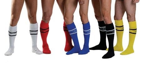 “These are the brand new Mister B Football Socks from the Mister B URBAN Collection, which consists of sexy party- and swimwear we’re currently developing. These URBAN Football Socks with the Mister B logo are high quality socks; made of mixed fibre, we ensured that the foot of the socks is mainly made of cotton for comfort. Because cotton is a 100% natural fibre, you won’t get sweaty or smelly feet wearing these. Understanding the needs of the party crowd, each pair of socks features one small inside woven pocket, so you can more securely carry something in it when going out. Available in two sizes: 38-41 and 42-46, in five different colour combinations: Black with white White with black Red with black Blue with white Yellow with white “