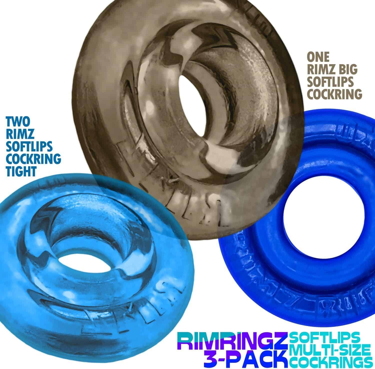 All three rings in the RIMRINGZ pack feature extended comfort lips on both sides. These smooth rubbery edges prevent digging, rolling, or pinching—so you can wear them longer and harder. Stack the two regular rings (Juice Orange & Hottie Pink) on your sack for a tighter, gradual stretch, or go heavy and fat with the RIMZ BIG (Black) for a comfort bulge that shows through every jock or pair of jeans. Sack play has never felt this good.