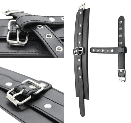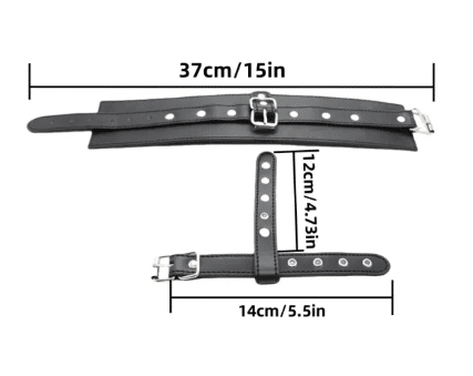 Designed for light bondage and fetish play, this black PU leather restraint set includes an adjustable wrist cuff and an ankle cuff, each with extended finger and toe loops for additional restriction. Made from durable PU and sturdy metal fittings, the cuffs are soft on the skin while delivering a firm hold. This piece is perfect for beginners and role-play enthusiasts who enjoy control, aesthetic, and comfort in one.