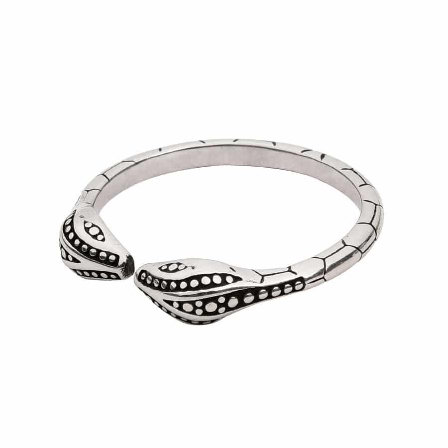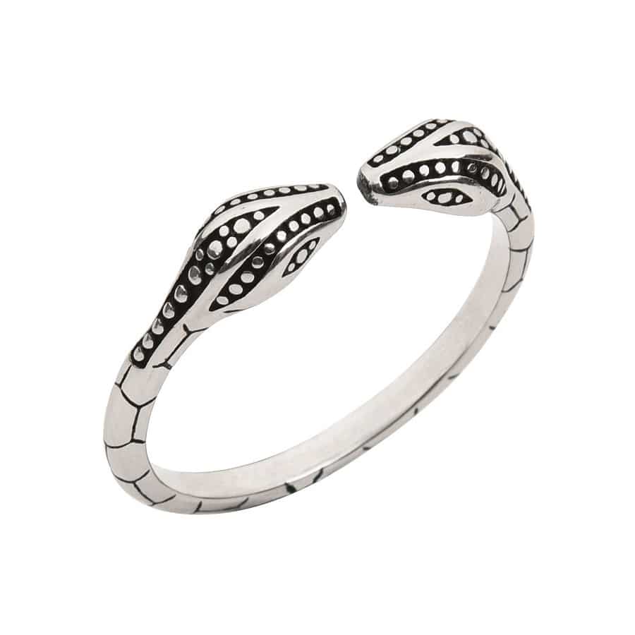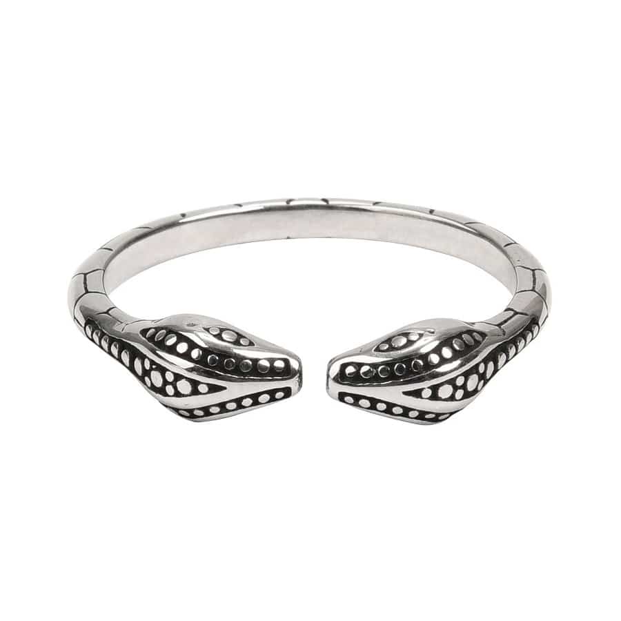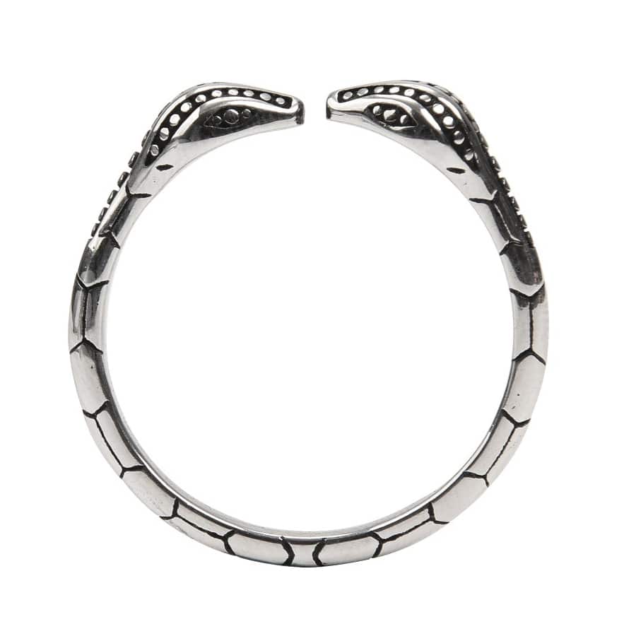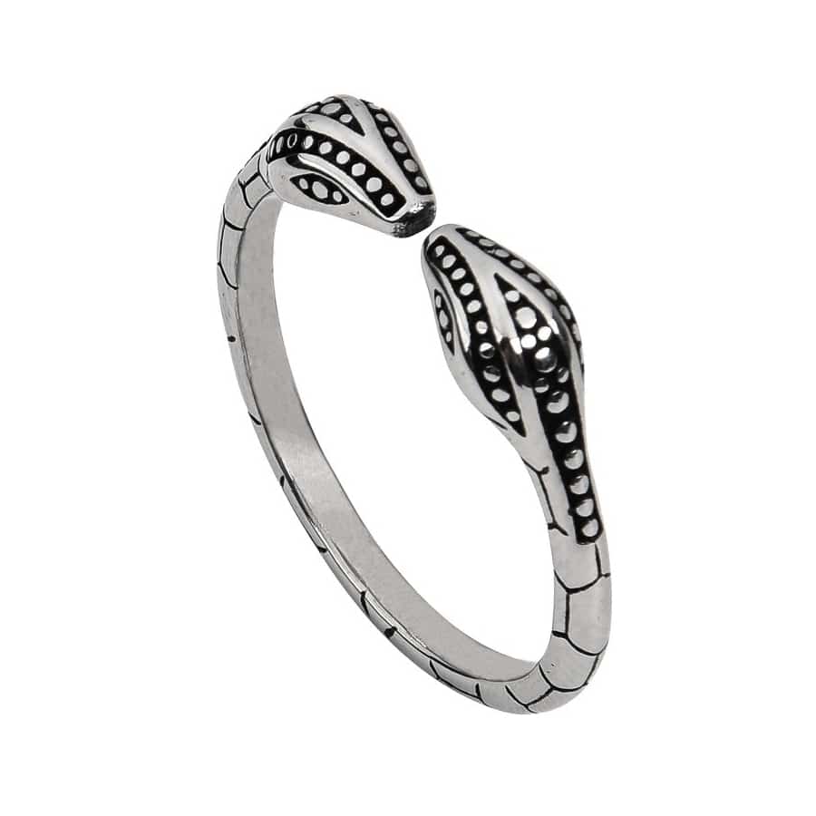 Metal tassel ring with two face-to-face snake heads. 6 mm thick.