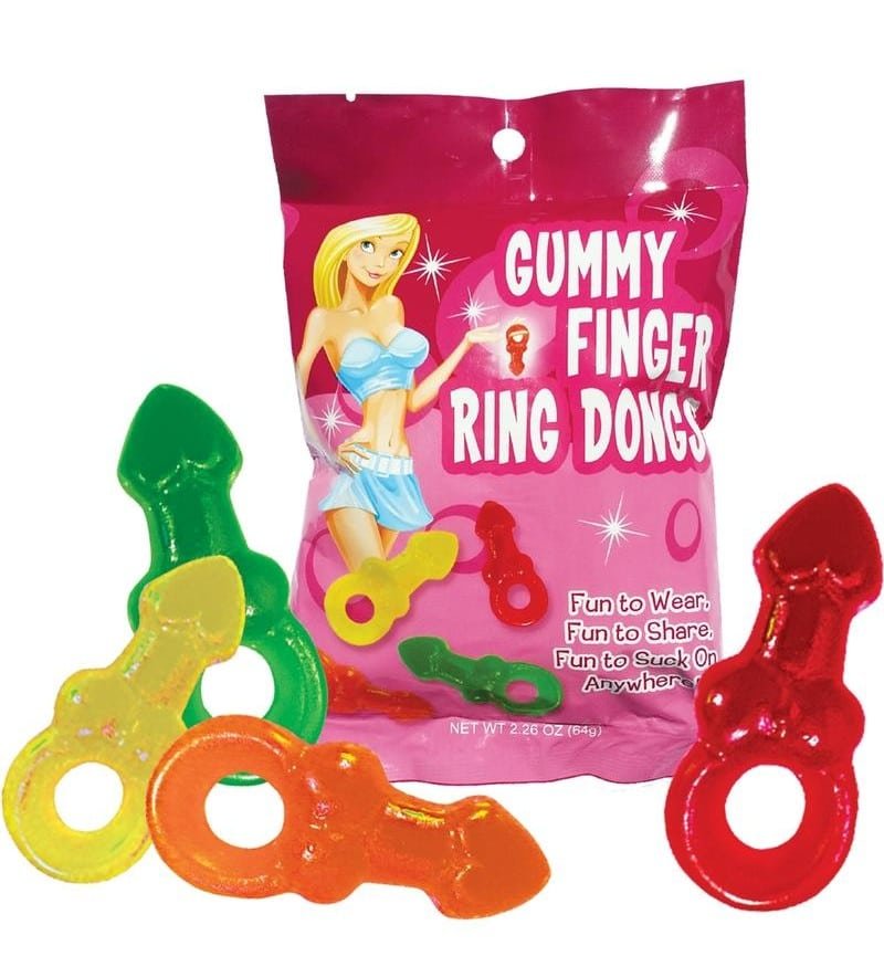Pecker shaped gummy rings – One size fits any finger. Four great flavors – Cherry, Orange, Lemon and Apple