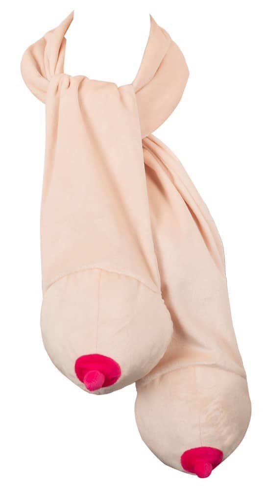 The nude-coloured scarf features a soft, plush boob with a pink nipple at each end, making it an instant eye-catcher.