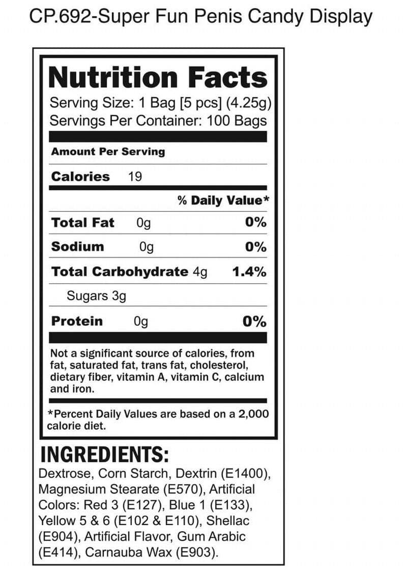 One of our top-sellers! This cute, penis-shaped, fruit-flavored candy is tasty and delicious. There are 6-pieces (4.5g) of penis candy per bag.