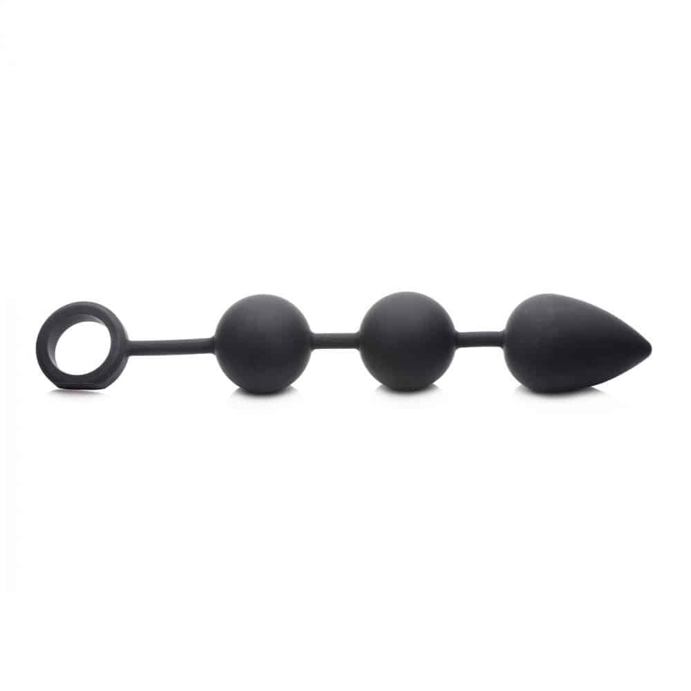 Explore a new level of anal pleasure with these unique anal beads that are not just huge, but heavy! These massive anal balls are internally weighted, with a silicone skin and convenient retrieval cord. The steel balls inside provide weight and resistance, while the silicone exterior provides a silky-smooth feeling. The first bulb features a tapered tip to make insertion more comfortable. The easy-retrieval cord has a large finger loop, also made of sturdy silicone, to tug these hefty spheres out at just the right time. The entire outside is non-porous, phthalate-free, and body-safe. Clean after use with mild soap or toy cleaner and avoid use with silicone lubricants.