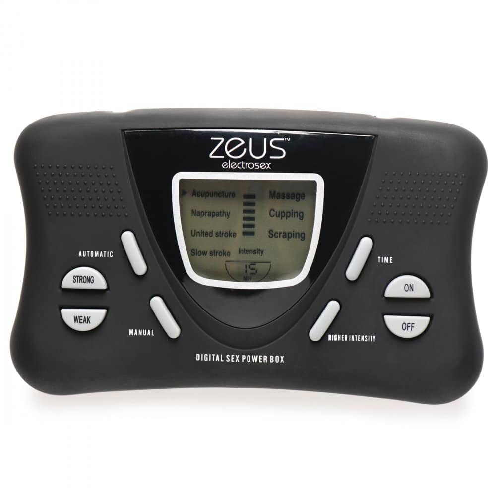 Electrify your experience with this shockingly easy to use and pleasure-packed E-stim kit! Included in the kit is 1 power box, 1 butt plug, 2 penis bands, 2 silicone pads, and 2 leads. The anal plug is made of nickel-free metal and ABS plastic. Insert it with the assistance of water-based lube or e-stim gel and enjoy the electric pulses in your backdoor. It will feel amazing on your prostate or A-spot! Use the penis bands and strap your rod in so it can electrify your shaft! Place the sticky, silicone pads anywhere below the beltline to add even more intensity to your experience! With this Zeus E-Stim power box, you have 8 intensity levels and 7 different e-stim modes including Acupuncture, Naprapathy, United Stroke, Slow Stroke, Massage, Cupping and Scraping. These modes mix massage, bodywork and stimulation to give you unique, pleasurable sensations unlike any other! All materials are phthalate-free and nickel-free so you can rest assured your new toy is body-safe!